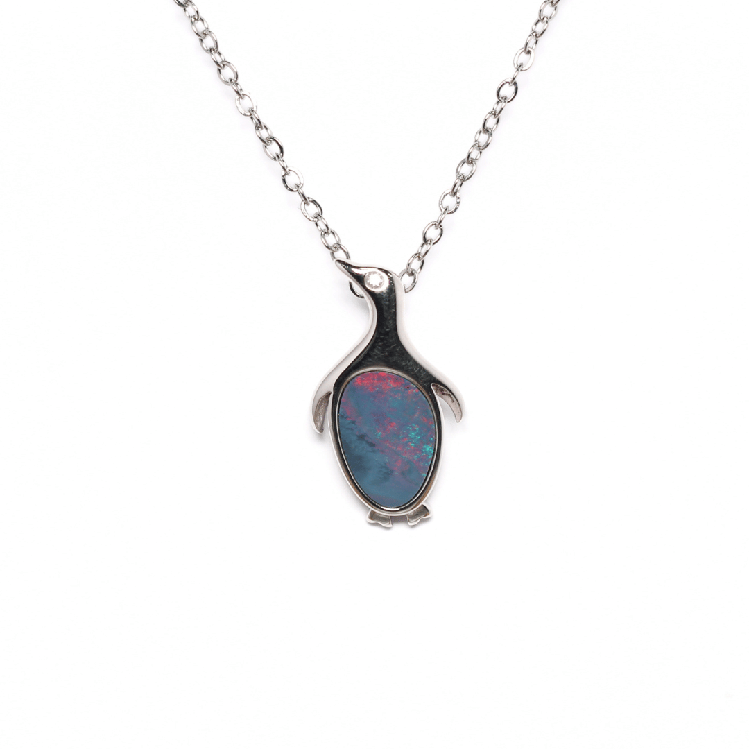 This charming penguin-shaped pendant, crafted from sterling silver, features a stunning doublet opal that showcases vibrant hues of blue, green, and red. The playful design adds a whimsical touch, while the opal’s captivating colours shimmer with every movement, making it a delightful addition to your jewellery collection.